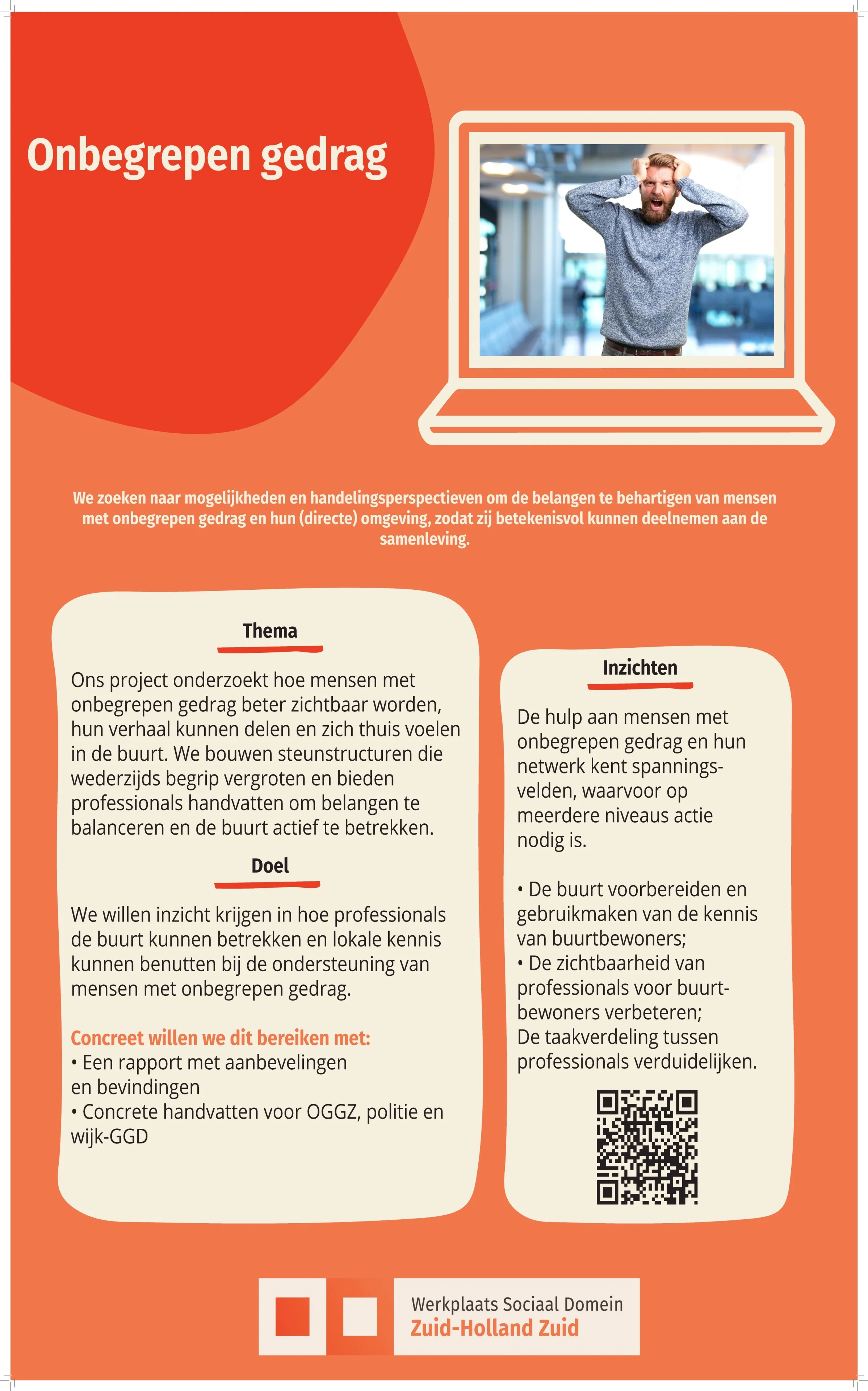 We willen inzicht krijgen in hoe professionals de buurt kunnen betrekken en lokale kennis kunnen benutten bij de ondersteuning van mensen met onbegrepen gedrag. Concreet willen we dit bereiken met:
