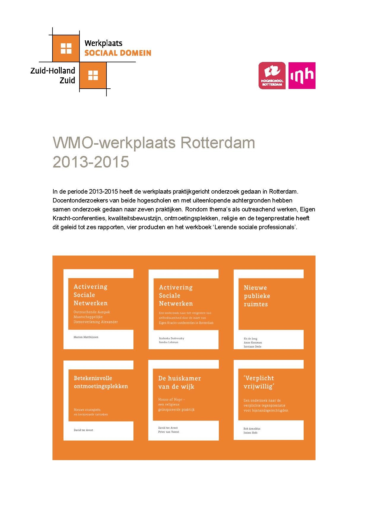 In de periode 2013-2015 hebben docentonderzoekers van beide hogescholen, en met uiteenlopende achtergronden, samen onderzoek gedaan naar zeven praktijken. Rondom thema’s als outreachend werken, Eigen Kracht Conferenties, kwaliteitsbewustzijn, ontmoetingsplekken, religie en de Tegenpresentatie heeft dit heeft geleid tot zes rapporten, vier producten en het werkboek ‘Lerende sociale professionals’.
